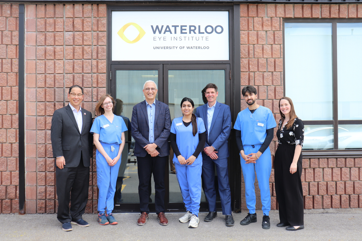 Steven Haifawi (third from left), president of HOYA Vision Care, visits the Waterloo Eye Institute with director Dr. Stanley Woo (left), incoming director Dr. Ben Thompson (third from right), associate director of advancement Kelsey Gagnon (right) and students (in blue scrubs).