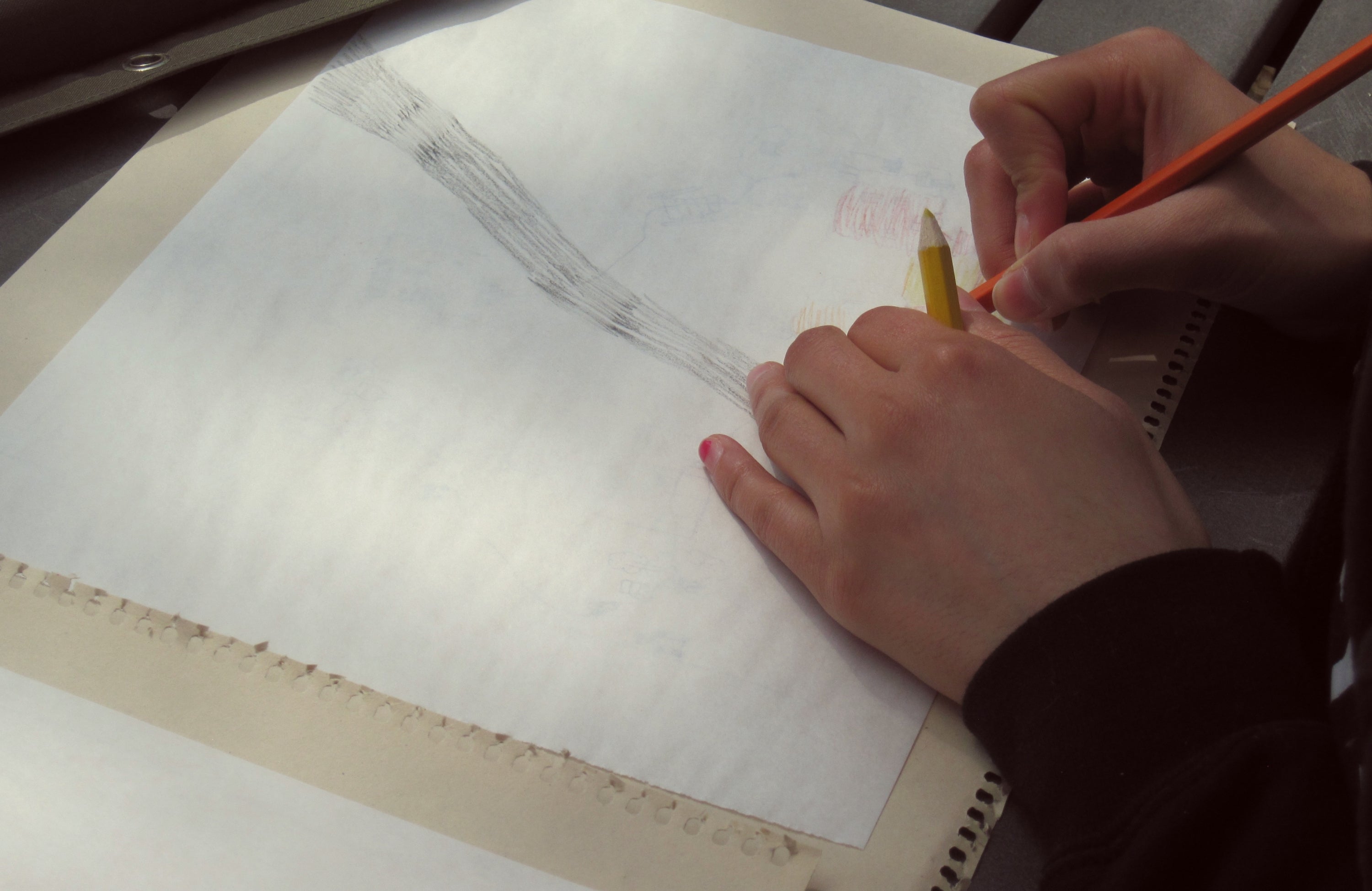 Immediately at the end of the walk, each participant drew in black on a piece of paper the journey that they travelled, as they perceived it. This paper was then overlaid by tracing paper on which each participant drew in colour the sensations and emotions felt throughout the journey.