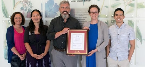 The Waterloo School of Pharmacy was recently awarded the Best Community Outreach Initiative by the Canadian Council for the Advancement of Education (CCAE). The award recognizes the Opioid Crisis Awareness Campaign led by Professors Michael Beazely and Kelly Grindrod and supported by staff members Mary Stanley and Alana Rigby, and by Adrian Poon, a member of the Grindrod lab.