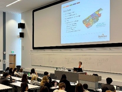 Dr. Brian Doucet, associate professor in the School of Planning, invited Dorothy McCabe, City of Waterloo Mayor, to speak to students in PLAN 100: Urbanization Today – Introduction to Cities and Regions. The School of Planning regularly welcomes guest speakers to its lectures to enrich student learning and foster connections to current social challenges.