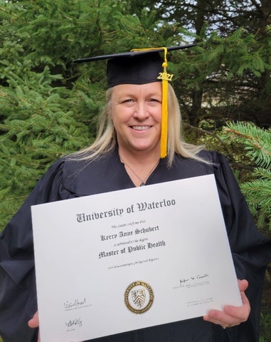 Kerry’s career took her from front-line healthcare work to senior leadership at a local public health unit. And with those growing responsibilities came the realization that post-graduate education would help her further her impact. She decided to pursue the MPH program at the University of Waterloo, and it turned out to be the perfect fit. The program’s flexibility, especially the part-time, remote learning option, made it easier for her to balance work and study—especially important as the COVID-19 pandemic made an already demanding job even more challenging.