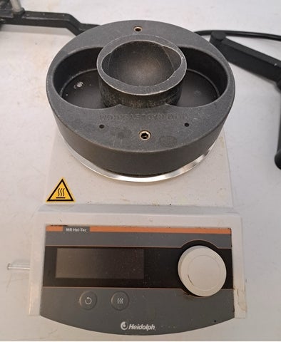 Heidolph hot plate with heat-on attachment. Inserts are available for 50 and 100 mL flasks and different heat-on attachments fit larger flasks.