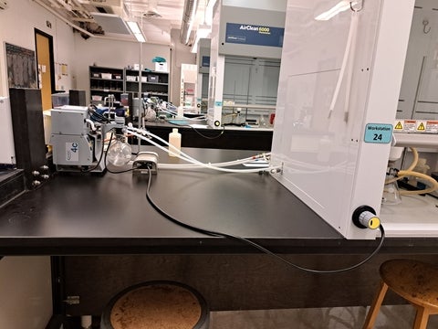 The fume hoods were placed on the benches after being modified to be fully flat. The hoods use a double stack of activated carbon filters and have a sensor for breakthrough of organic fumes as well as a pre-filter for dust and particulates. Filters are changed every year and the fume hoods have a count down to the date of replacement.