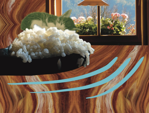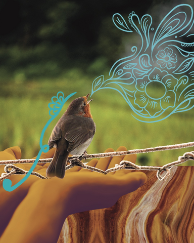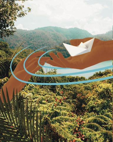 Cultivating Care breathes with the rhythm of Ginhawa, a Visayan concept embodying breath, life, ease, and well-being. In this work, breath becomes both liberation and connection: the air that flows through care labourers, healers, and dreamers across geographies as they make roots in new homes. Layered linework, water, nature and hands weave together scenes of labour and rest. A bird exhales flowery energy over sprouting rice, nourishment in shared communion with a kitten at rest who purrs and sends waves of healing vibrations. Ripples extend from a paper boat echoing migrations movement while a raised fist blooms beneath a radiant sun. Tea steams beside an open book, a hammock, and a window filled with flora that becomes a portal to restoration.