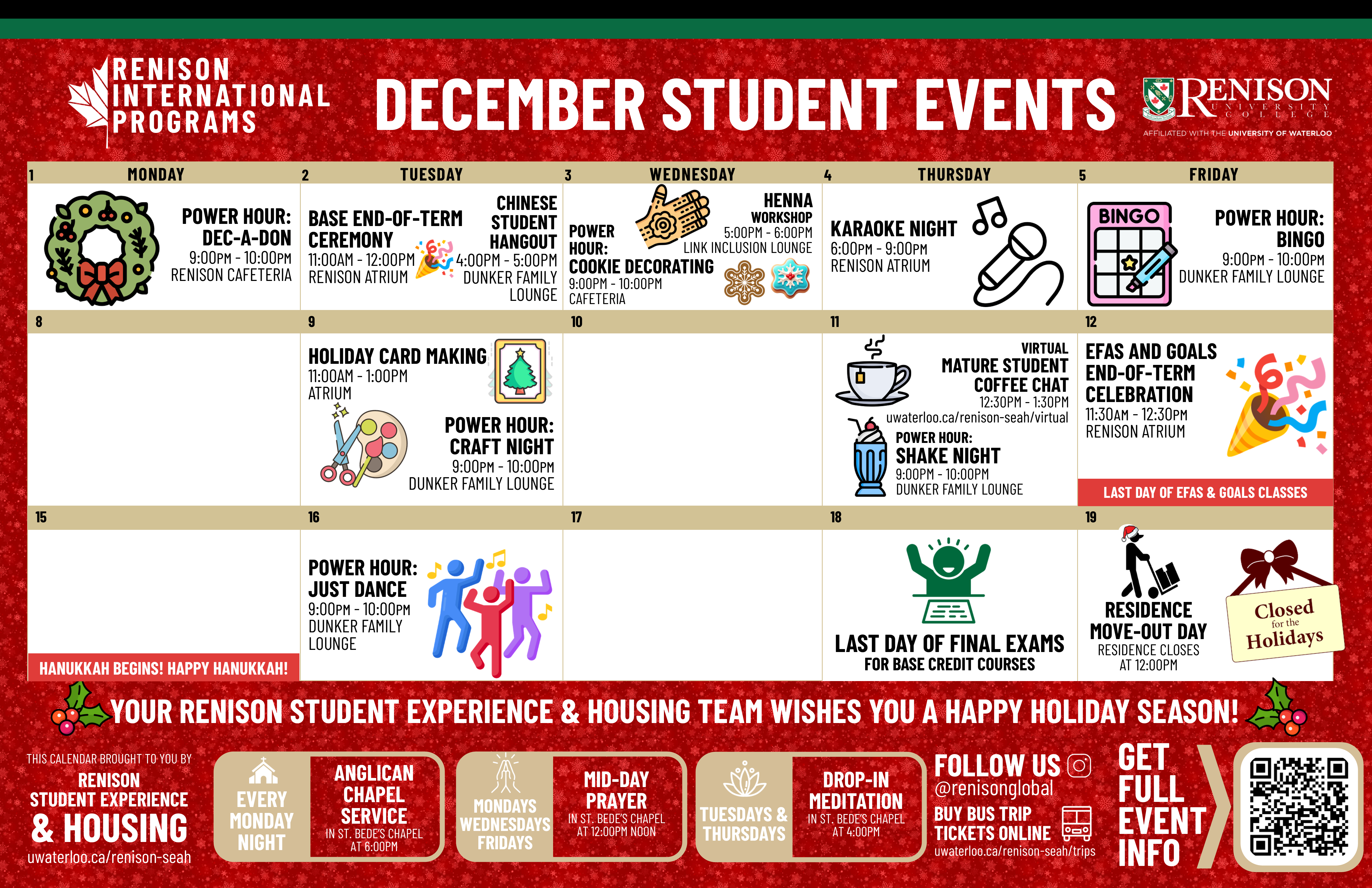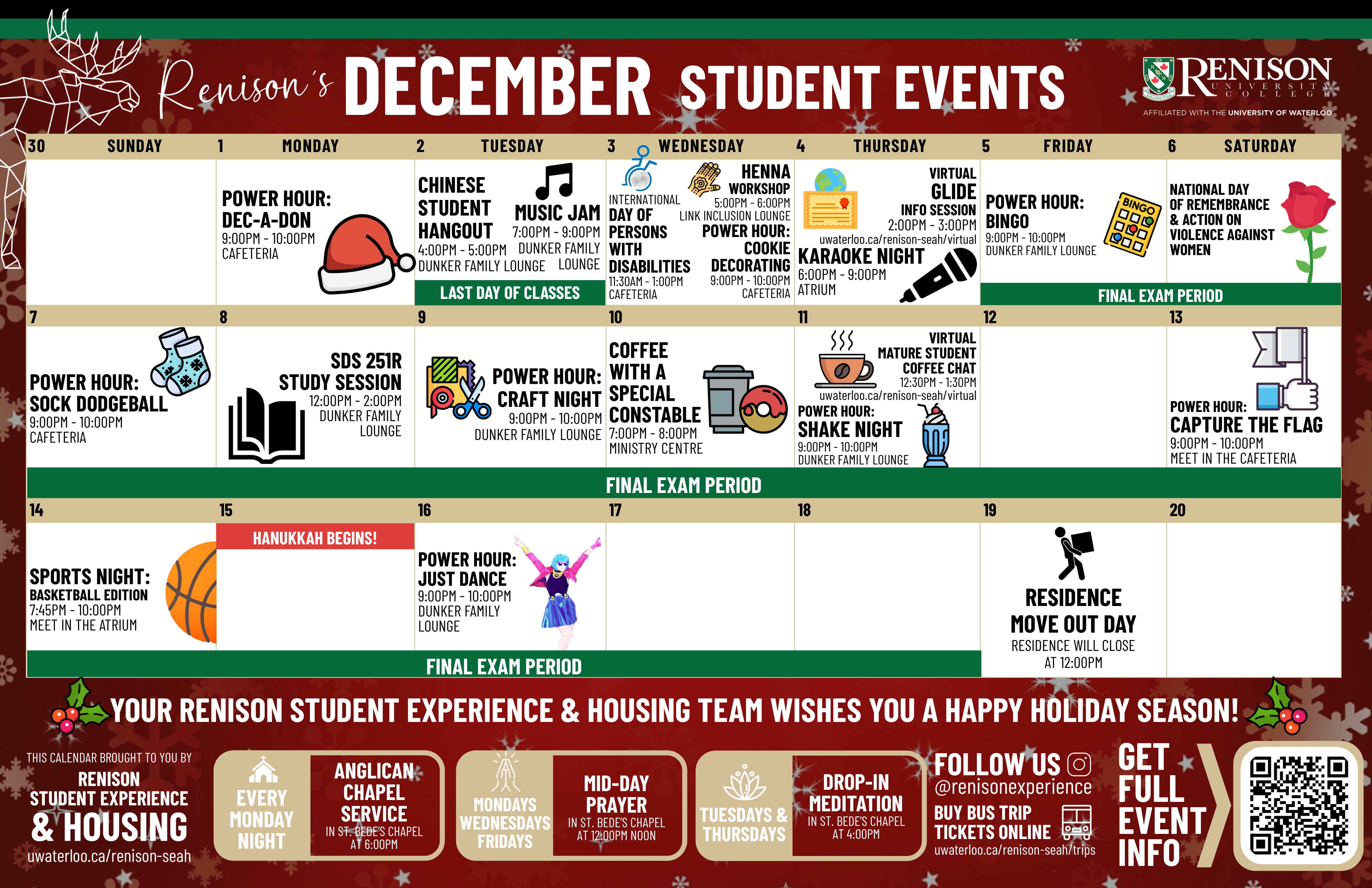 December means more than exams! The holiday season is upon us, and we're excited to take opportunities to help you de-stress during the exam period. Don't miss all of the awesome Power Hour events happening.