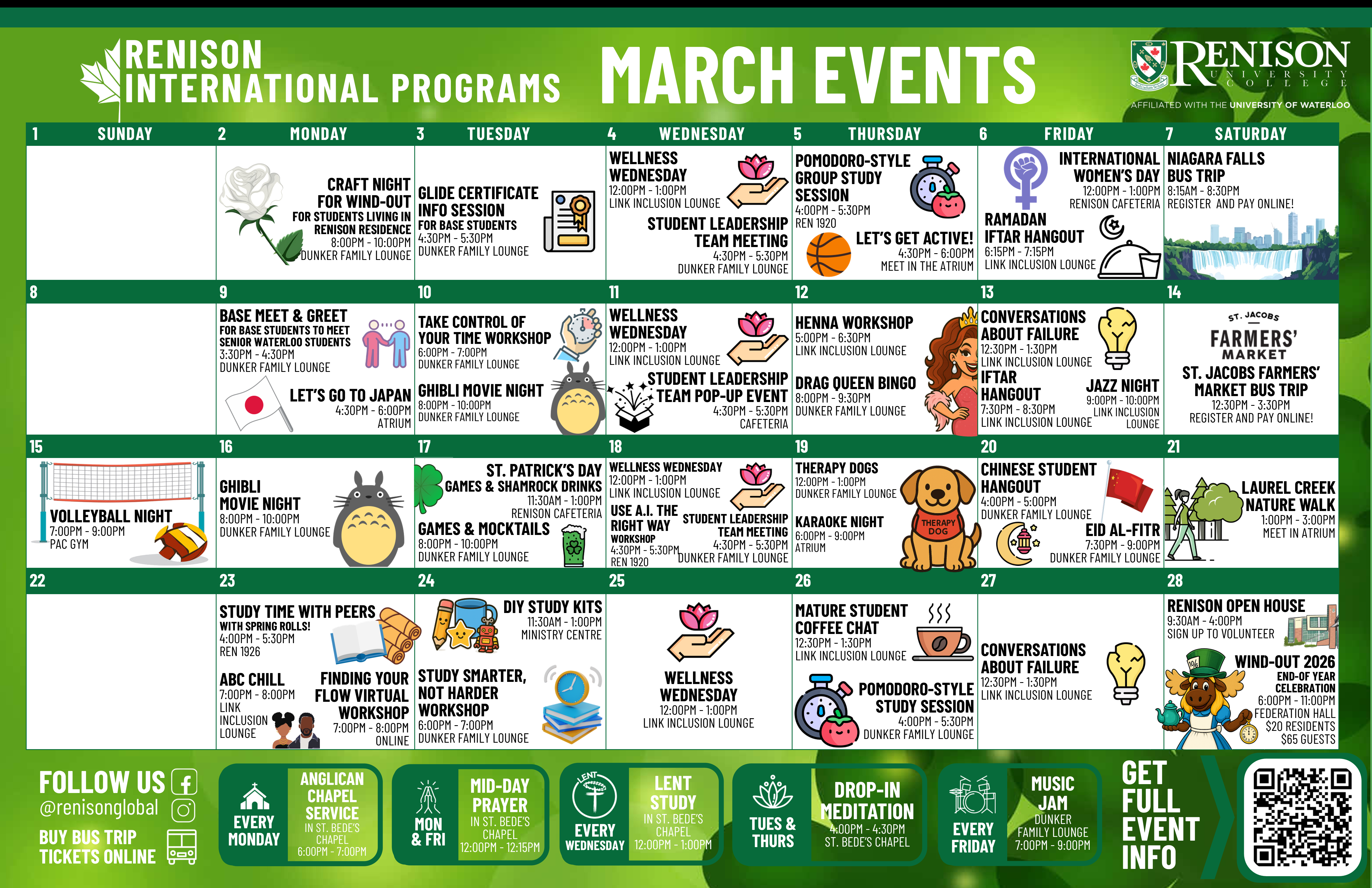 Visit our Student Experience and Housing Events Calendar page to read descriptions and full details about each event. We encourage you to download the iCal on our Events page so that you can easily view all upcoming events from your phone!