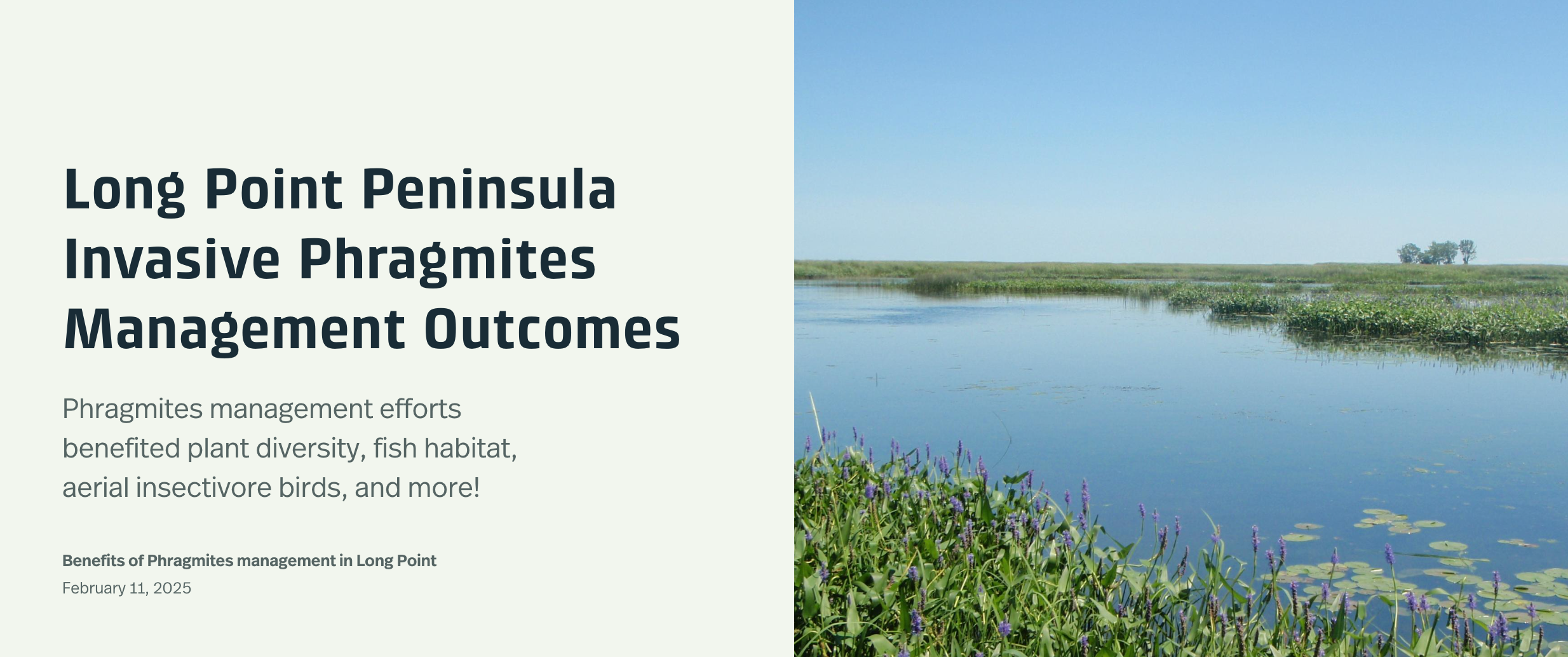 The Long Point Peninsula Invasive Phragmites Management Outcomes Story Map, highlighting the successes of the long-term management program in Long Point marshes, is now live! The interactive Story Map, created by Waterloo Wetland Lab alum, Grace Lew-Kowal, can be accessed online.