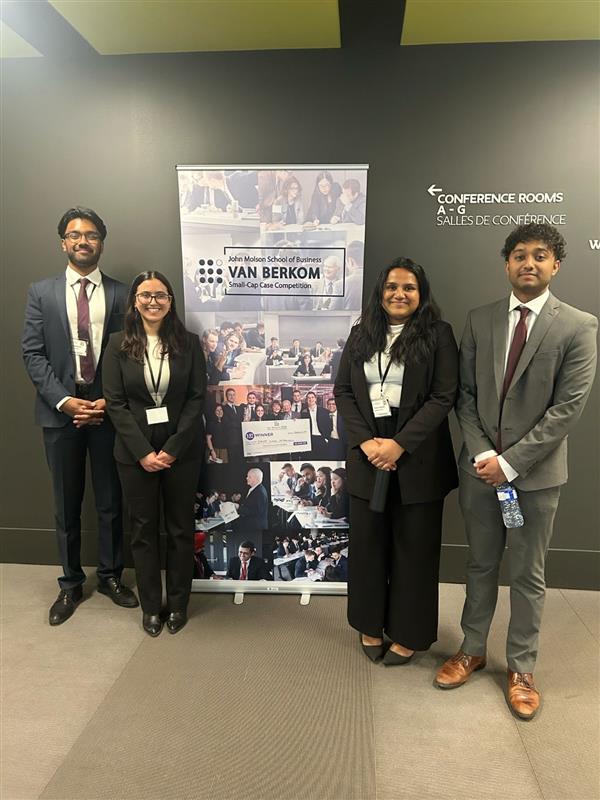 On March 22–23, our team of 3rd year students, Jei, Nishan, Tianna (AFM), and Anoosha (Biotech/CPA), had the opportunity to represent the University of Waterloo at the Van Berkom John Molson Small-Cap Case Competition, hosted at Concordia University in Montreal. The competition brought together students from across North America to pitch investment ideas for small-cap public companies (those with a market capitalization ranging from approximately $300 million to $2 billion) over two fast-paced, high-intensity days.