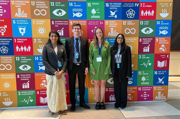 University of Waterloo Ph.D. students Navya .V. Nair, Kevin B. White, Isabel Jorgensen, and Harshina Brijlall attend the UN Water Conference at UN Headquarters in New York, March 22–24.