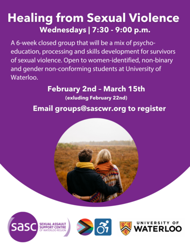Join us for a 6-week closed group that will be a mix of psycho-education, processing and skills development for survivors of sexual violence. Open to women-identified, non-binary, and gender non-conforming students at the University of Waterloo - presented by the Sexual Assault Support Centre of Waterloo Region and the Sexual Violence Prevention and Response Office.