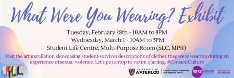 Join the Sexual Violence Prevention and Response Office (SVPRO) and Sexual Assault Centre for Waterloo Region (SASC) for the What Were You Wearing? art installation. What Were You Wearing? is an art exhibit based on student-survivor descriptions of the clothes they were wearing when they were sexually assaulted. Sexual assault survivors are often asked, “what were you wearing?”, implying that what someone wears can cause a sexual assault.