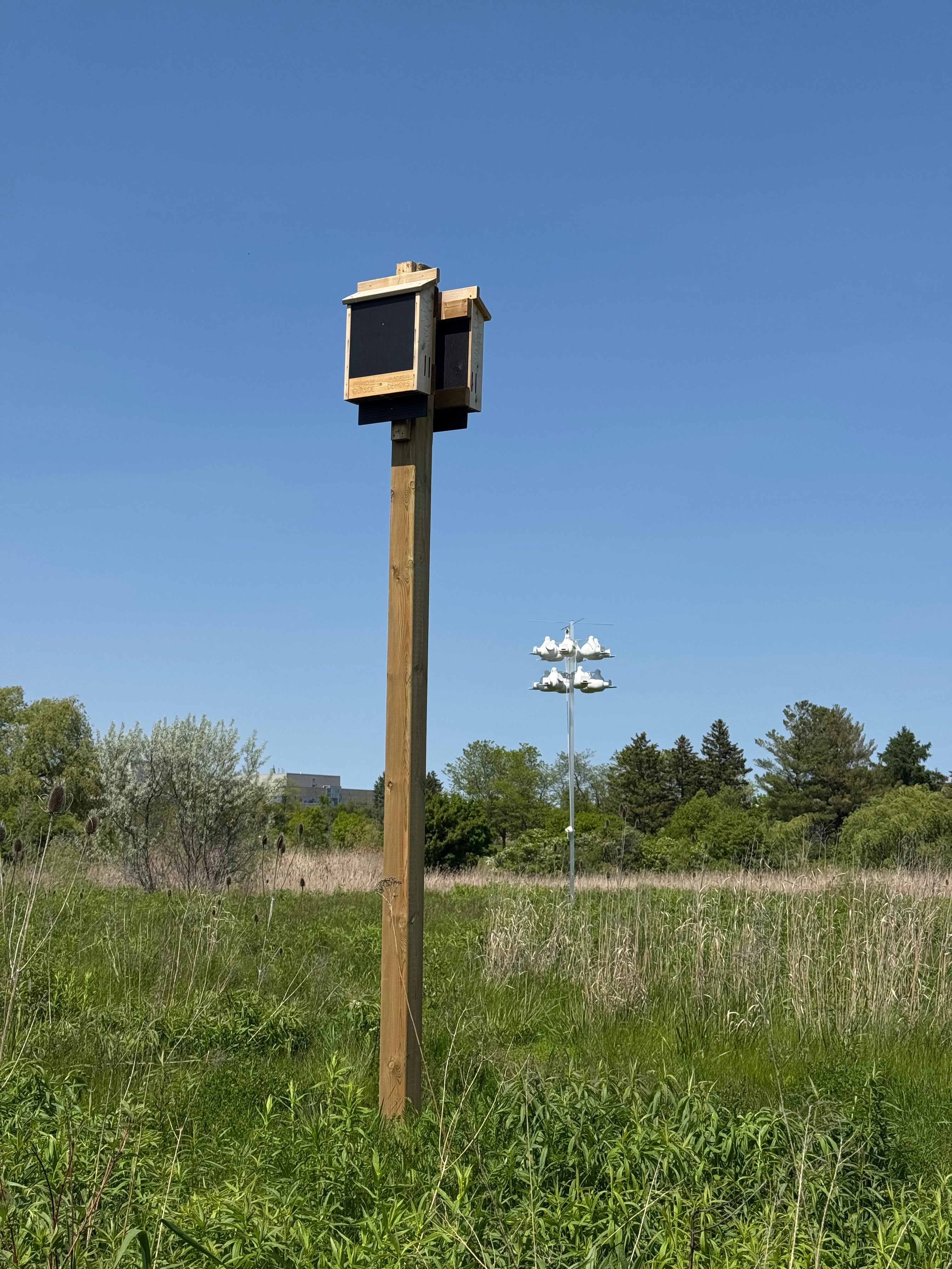 The University of Waterloo’s Environmental Reserve is one of the most biodiverse habitats in the Region of Waterloo, with over 235 bird species, 755 insect species and 410 plant species recorded. As part of ongoing conservation and restoration efforts, the University has installed a variety of artificial habitats to support native wildlife and help address habitat loss affecting several local species, including 30 tree swallow nest boxes, 10 bat boxes, 2 wood duck nest boxes, and a multi-compartment Purple Martin hotel.