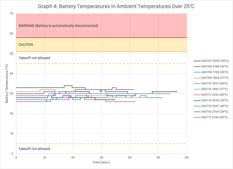 Overall, the e-plane was designed to handle hot days with battery temperatures remaining well within the normal range. The discharge rates or energy used for various flight activities at high temperatures remained similar to those at lower temperatures.
