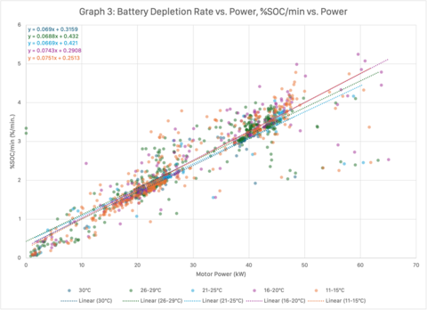 Graph 3 compares the rate of change of SOC (how fast the battery is discharging) with the average power over that interval (1% SOC). The flights are grouped by OAT at take-off. A line of best fit is calculated for each temperature grouping and all are very similar. The slopes of the lines indicate that for each 1 kW increase in power, the rate of energy consumption will increase by roughly 0.07 %SOC/min. In other words, increasing power by 10 kW will increase the rate of energy consumption by 0.7 %SOC/min, or an extra 7% SOC every 10 minutes. The slope of the line, or the increase in energy consumption, is smallest (0.067) for flights with an OAT in the 21-25°C range. Higher temperature flights (26-30°C) had a slightly steeper slope of 0.069 while lower temperature flights had a steeper slope of 0.074 or 0.075. However, the differences in the slope of the lines for each group of flights were small in comparison to the spread in the values of the dots. The lack of differences is especially strong when looking at the 15-25 kW power setting that is used most for cruise flight. Overall, the differences between groups of flights at different temperatures are not statistically different for the small number of flights observed. In other words, when flying in a temperature of 30 °C the e-plane delivers the same power as when flying in the 20s.