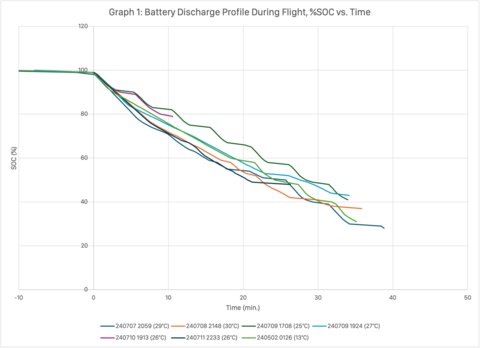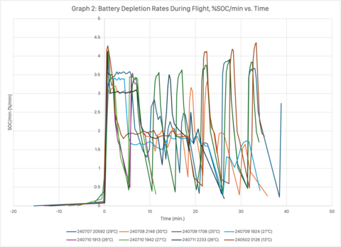 Graph 1 shows the State of Charge (SOC) of the aircraft’s batteries versus time. The SOC decreases from 100% at take-off to around 30%, the minimum reserve that is recommended when landing. The legend notes the outside air temperature (OAT) at take-off for each flight. The observed slope for each flight is similar. A cooler weather flight (13°C) is added for comparison. It fits right in the middle of the hot weather flights (26°C+), indicating no difference in performance.
