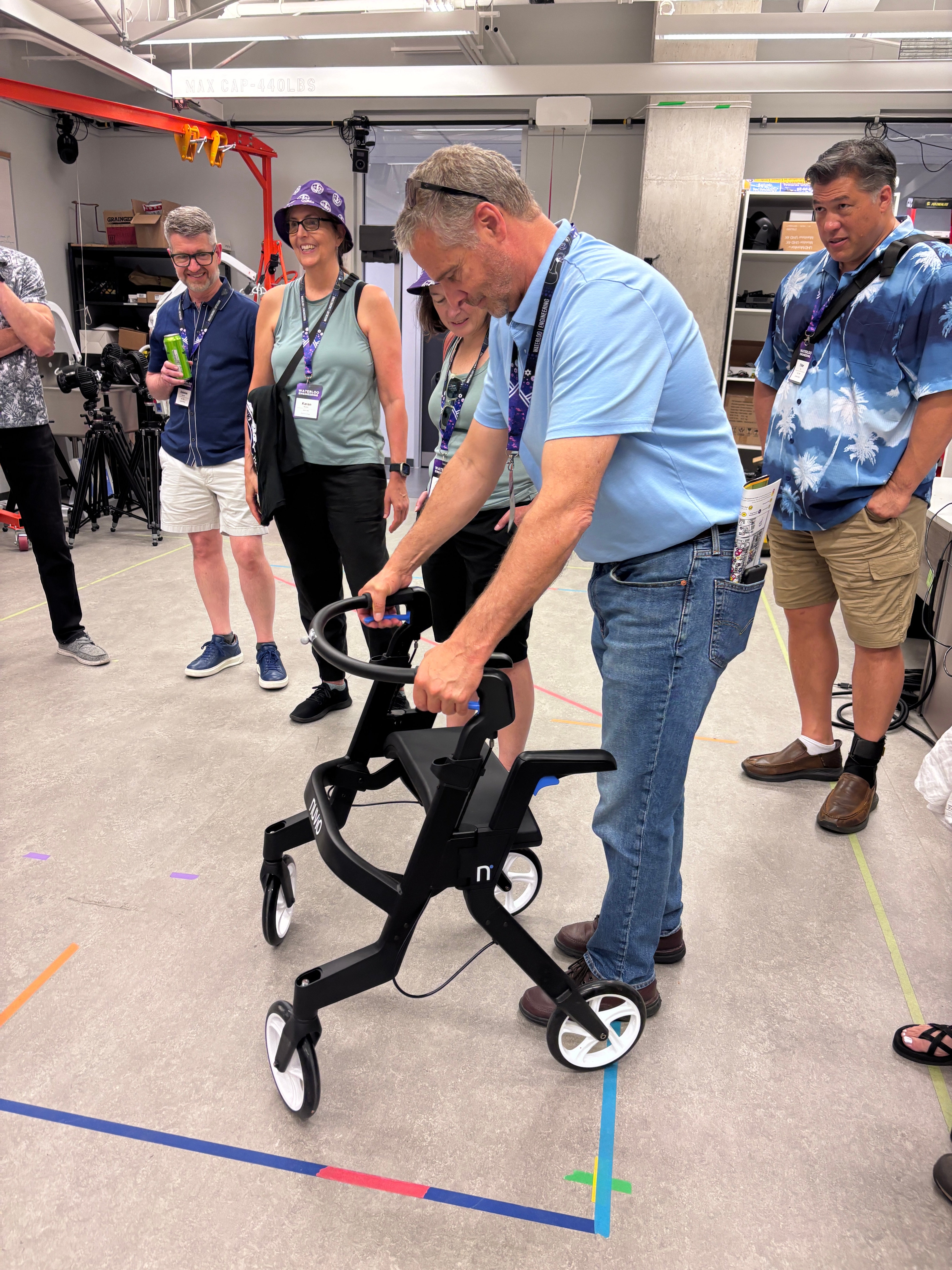 In the Motion Capture Lab, Dr. James Tung gave real-time demonstrations of a brain-computer interface integrated into a sensor-powered autonomous wheelchair. Alumni also had the chance to try out walker prototypes designed to improve load transfer during movement, offering new perspectives on assistive mobility technology.