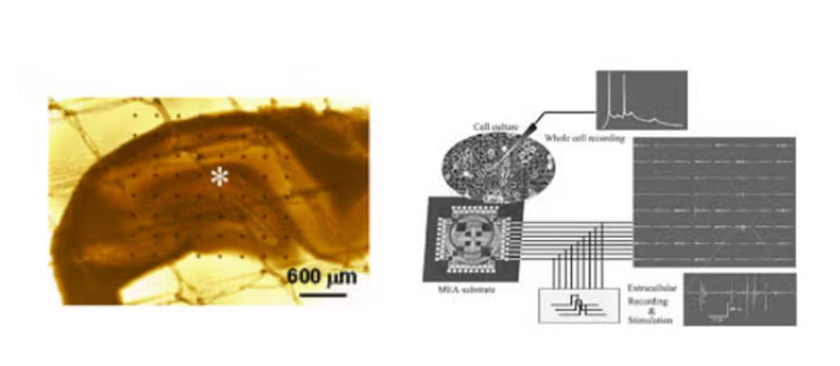Experiments involve measuring electrical activity in animal brain tissue: Typical example of a rat brain (hippocampal) slice deposited on an 8 x 8 multielectrode array (MEA) chip (dark black dots). One electrode (marked by an asterix) is used for the electrical stimulation of the tissue slice. The other 63 electrodes on a chip pick up the local electrical response distributed over the slice (so-called field excitatory postsynaptic potential, or f-EPSP), which allows to record electrical activity in a living tissue for up to 8 hours. Image taken from Zhao et al., Molecular Pain 5, 55 (2009); https://doi.org/10.1186/1744-8069-5-55.