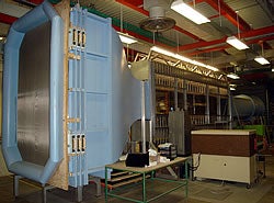 Aerodynamics testing is also performed in the Fluid Mechanics Research Laboratory, which is equipped with an open-circuit, adaptive-wall tunnel (figure 2) with a 91cm by 61 cm test section and an open-circuit, blower tunnel with a 61 cm square test-section. The adaptive-wall tunnel can nearly eliminate the effects of blockage by setting the adjustable walls in the shape of the outer streamlines of the flow and can be used for wind speeds up to 40 m/s. Common measurement techniques in this facility include LDV, hot-wire anemometry, and numerous flow visualization techniques.