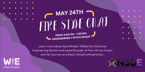 The Women in Engineering Committee, in collaboration with the National Society of Black Engineers, will be sitting down for a fireside chat with Ajoa Mintah, UWaterloo Chemical Engineering graduate and owner/founder of Four All Ice Cream. We will be speaking with Ajoa about her journey as a black, female entrepreneur. Participants will have the opportunity to ask Ajoa about her experience and journey from engineering student to business owner. Register now for this exciting event!